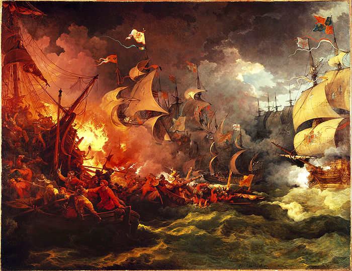 On this day, close to midnight, the English set alight eight large fireships and sent them downwind among the closely anchored ships of the ‘invincible’ Spanish Armada just off Calais in the north of France. The Spanish were afraid that these uncommonly large fireships were ‘hellburners‘, specialised fireships filled with large gunpowder charges that had been used to deadly effect at the Siege of Antwerp, and most of the Spanish fleet cut their anchor cables and scattered in confusion. The following day, in the Battle of Gravelines, the Spanish fleet, still disorganised, suffered considerable losses but eventually managed to escape, with the help of a southerly wind, up the east coast of Scotland. However, when they tried to return to Spain down the west coast of Scotland and Ireland, many were driven onto the rocks by strong winds and destroyed. It was an overwhelming victory for the English, while in Spain the news of the disaster brought shock and despair and the nation went into mourning.