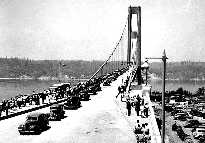On this day, the Tacoma Narrows Bridge, a suspension bridge in the U.S. state of Washington that spanned the Tacoma Narrows strait of Puget Sound between Tacoma and the Kitsap Peninsula, dramatically collapsed into Puget Sound. The bridge’s collapse has been described as “spectacular” and in subsequent decades “has attracted the attention of engineers, physicists, and mathematicians”. Throughout its short existence, it was the world’s third-longest suspension bridge. During construction, the bridge was nicknamed ‘Galloping Gertie’ because of the way it swayed in windy conditions, and on the morning in question, with 64 km/h winds, the alternating twisting motion gradually increased in amplitude until the bridge finally tore apart. The collapse boosted research into bridge aerodynamics-aeroelastics, which has influenced the designs of all later long-span bridges.