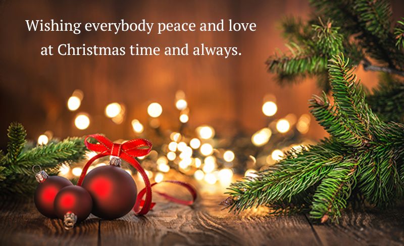 Red Christmas Ornaments on Wood Background and defocused lights. Spruce Tree branch on the left and right.